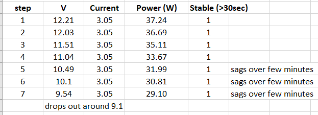 The one thing I did notice that although these supplies can be stable over 30 seconds, they tend to droop over time. And when they hit the threshold voltage they will automatically shutoff. From these tests its evident that the useable adjustment range is only around 10.5 – 13.5V. Note that I didn’t try going above 12V, but from my research raising the voltage seems to be easier.