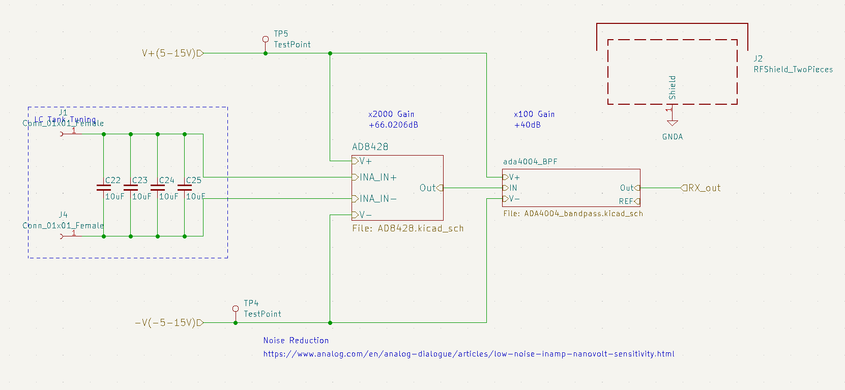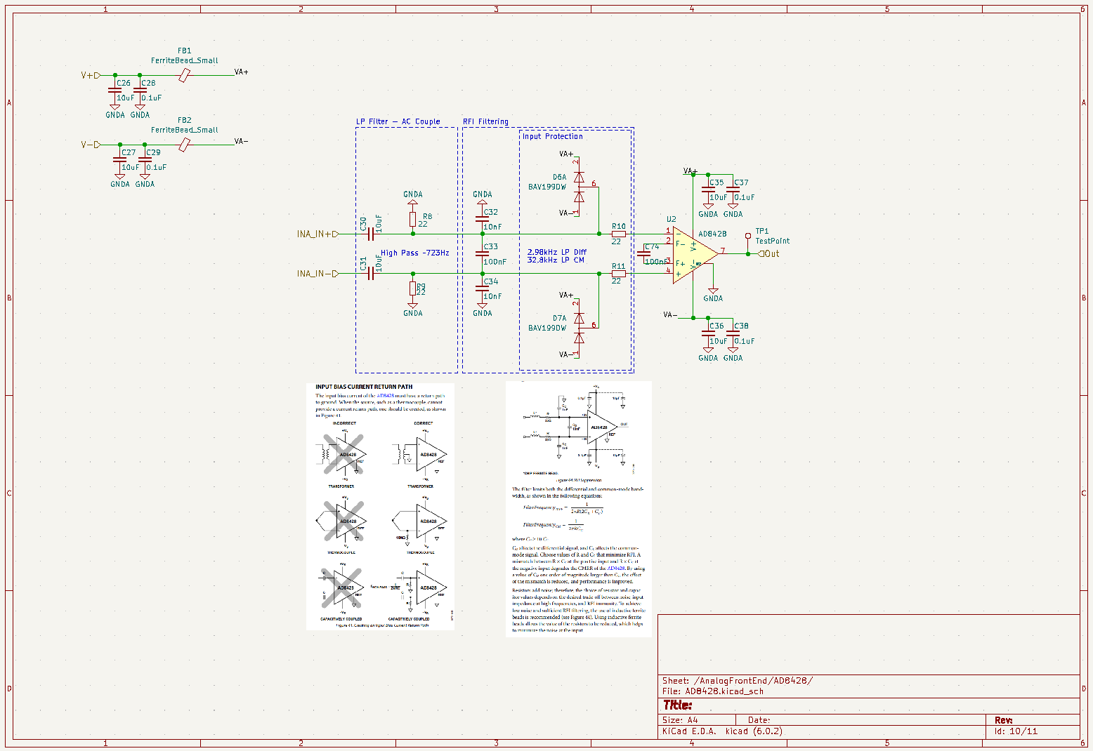 - High Gain amplification. For this I’m using an AD8428 fixed 66dB gain low noise instrumentation amplifier. In addition to its low noise characteristics its not exorbitantly expensive like jfets. You can dead-bug these amplifiers to improve the noise characteristics as outlined in this application note. Awesome paper in general is this one.