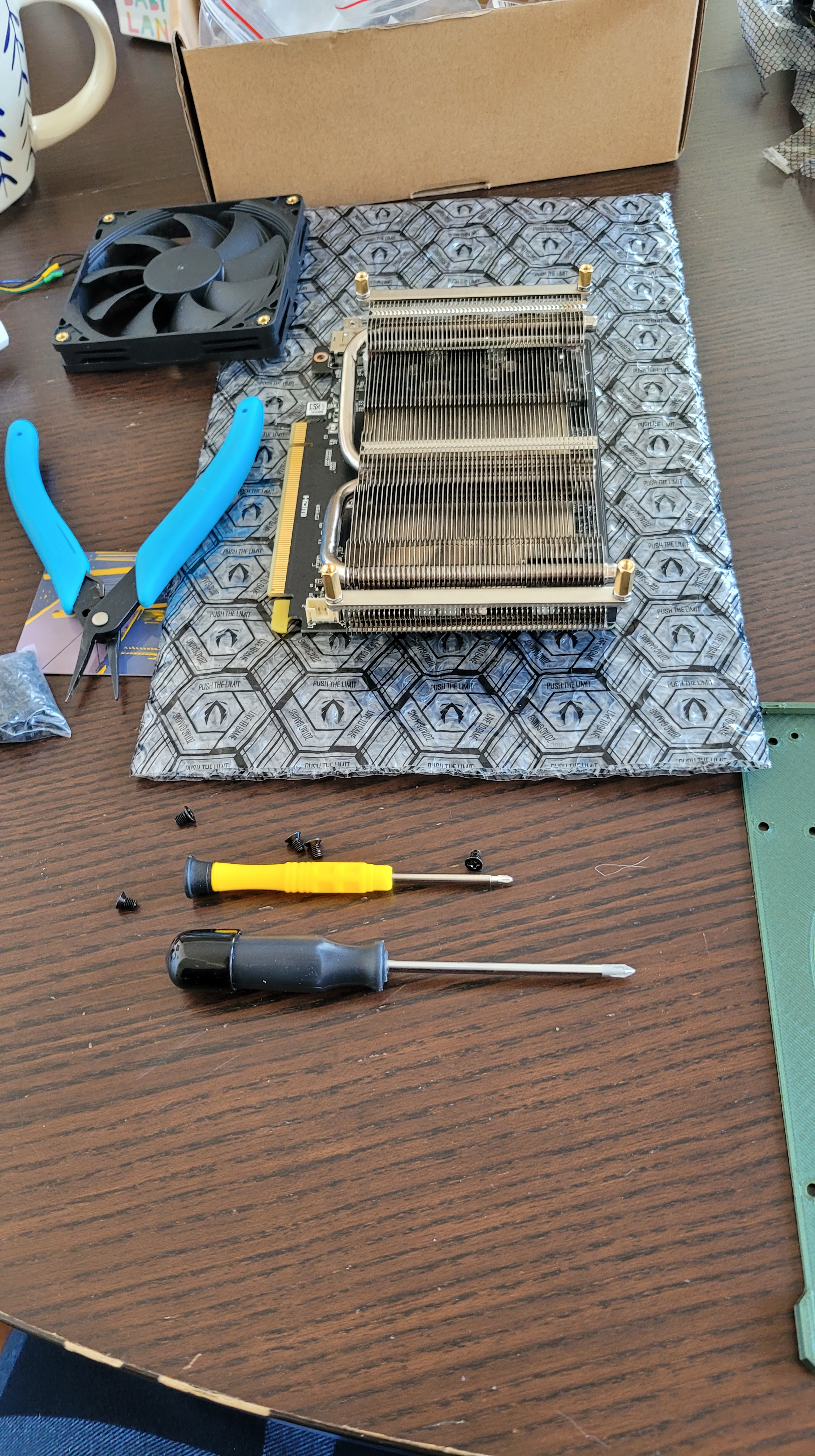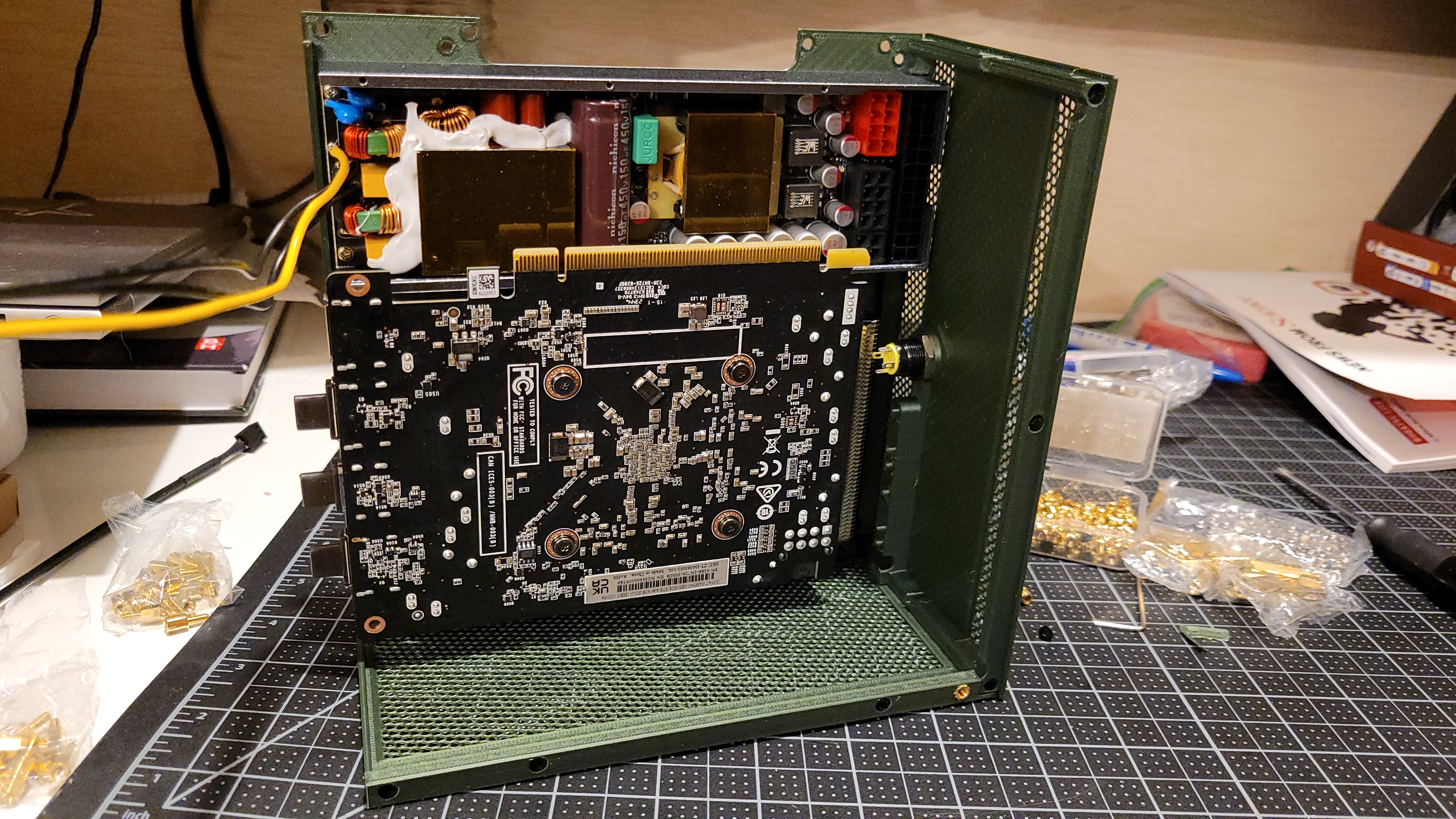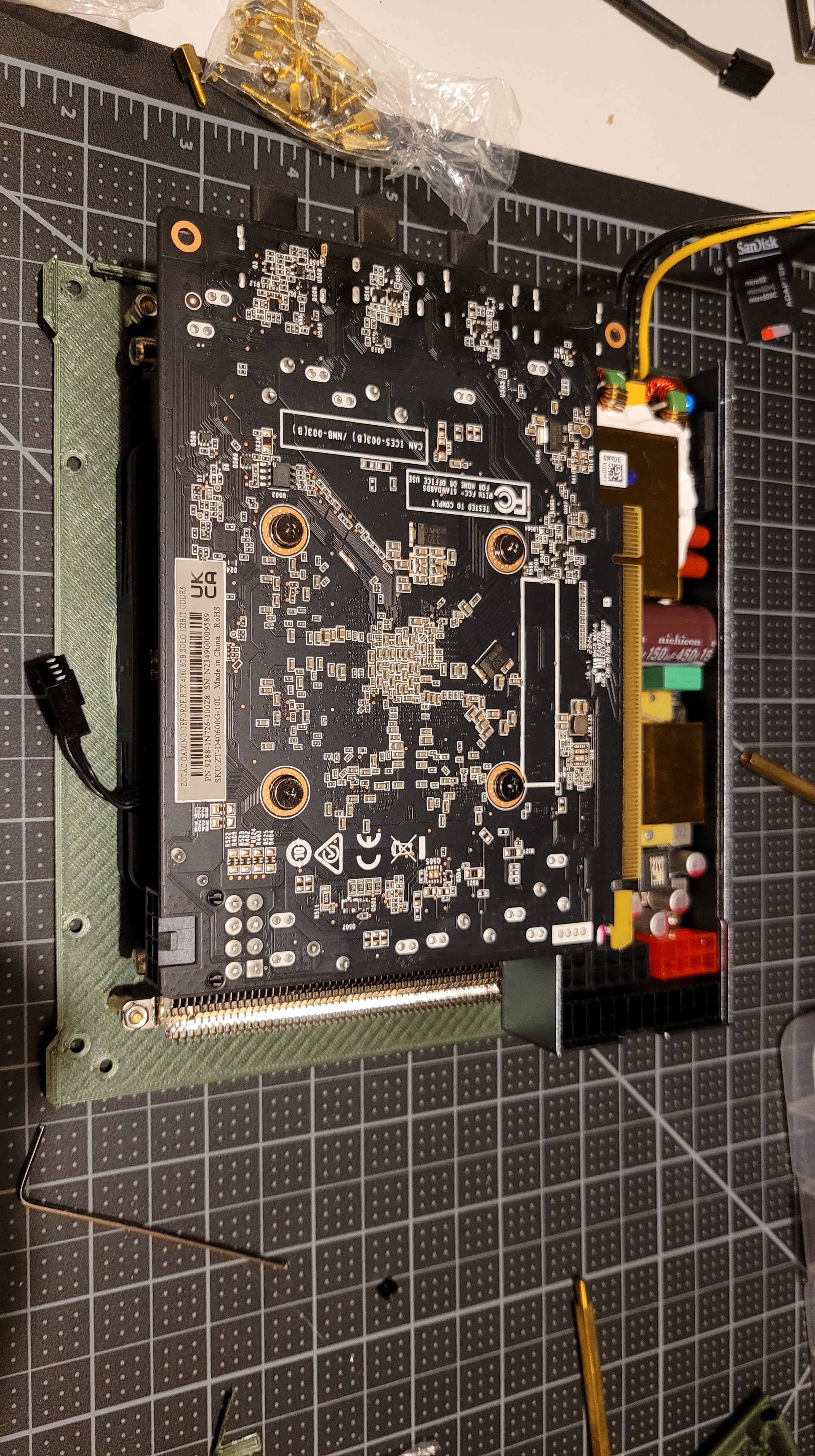 First up was the GPU panel which consisted of the PSU and the GPU. The GPU was integrated to the panel utilizing M2.5 standoffs and screws. To accommodate the heatsink height differential I found that adding a M2.5 nut was enough to space things appropriately.