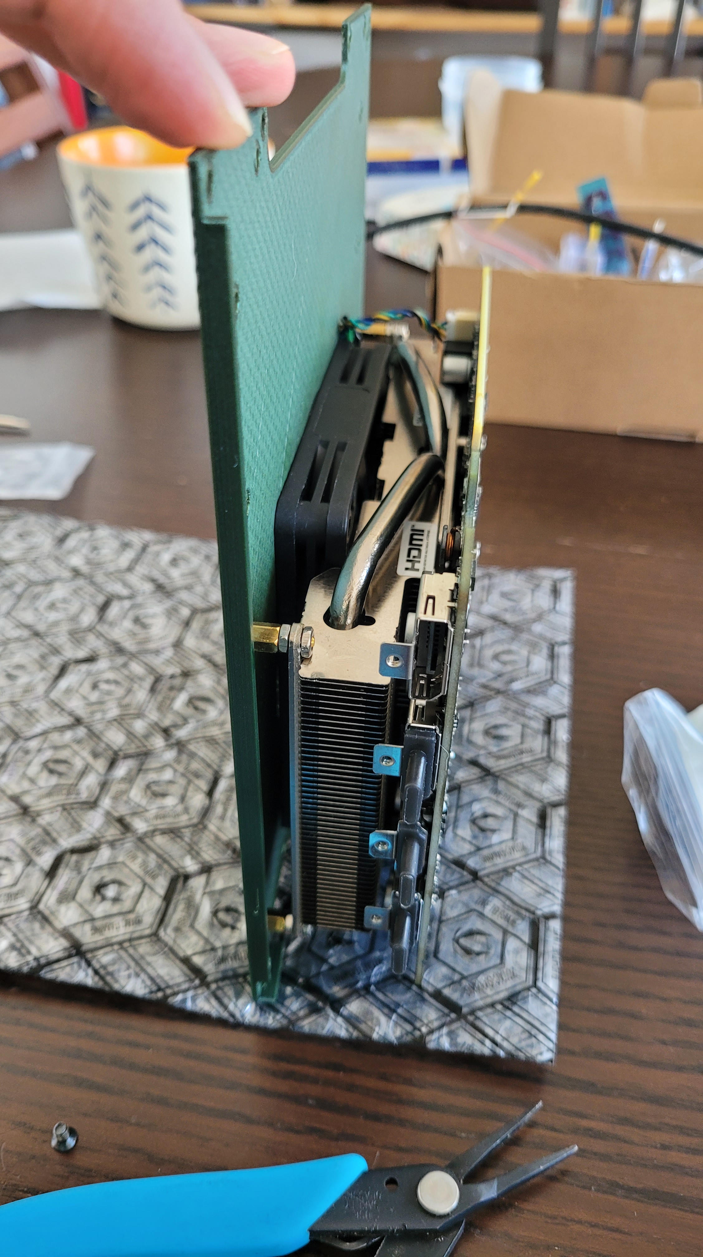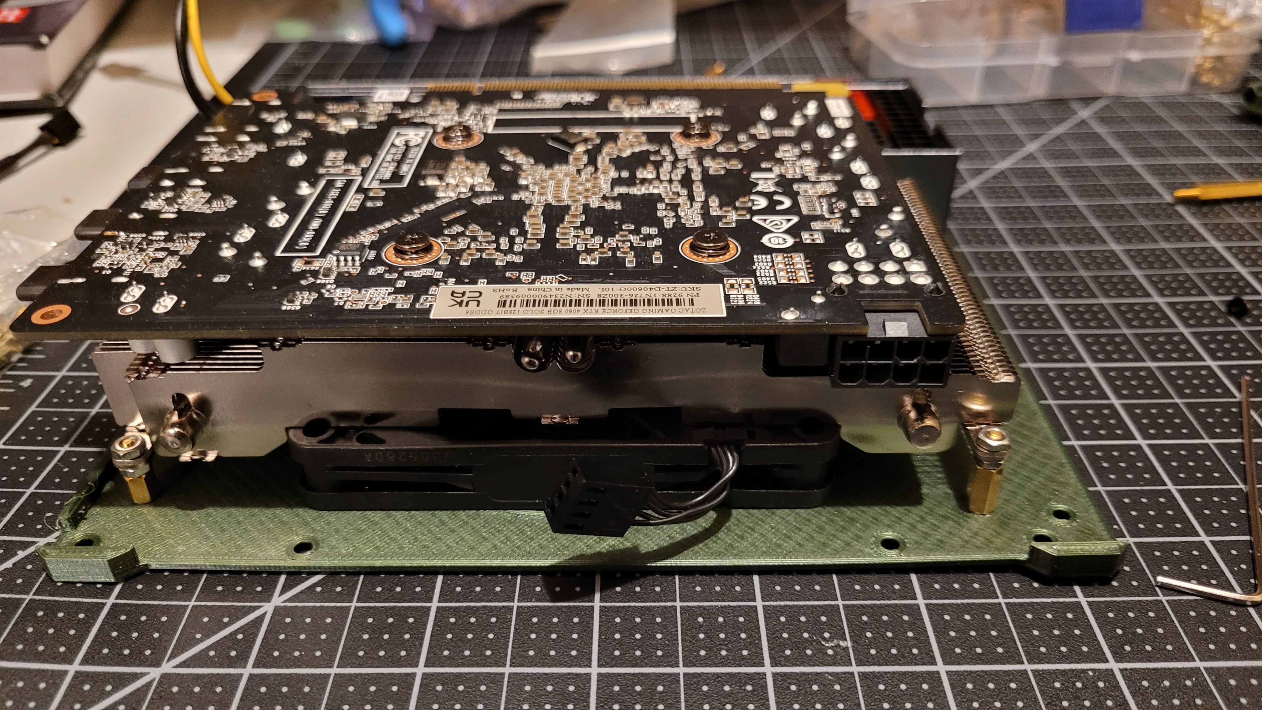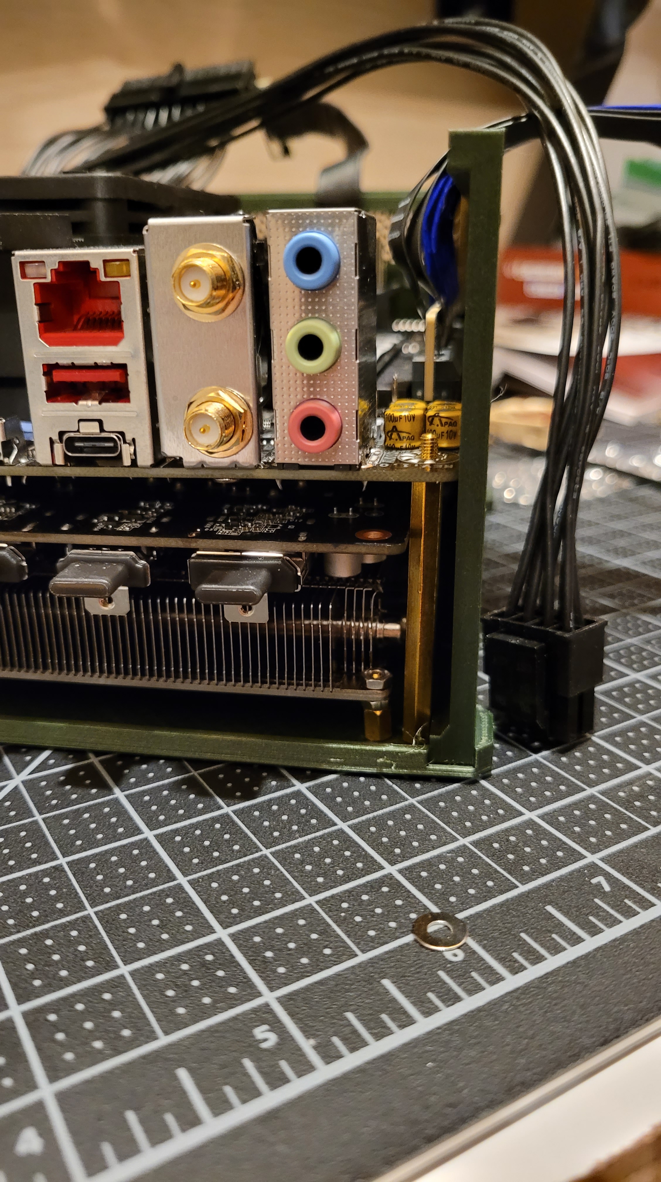 I selected mounting the GPU’s heatsink to the side panel over utilizing the GPU’s PCB mounting holes because >90% of the mass of the GPU is situated within the heatsink. By anchoring the heatsink I didn’t have to worry about the GPU’s pcb flexing and causing clearance issues.