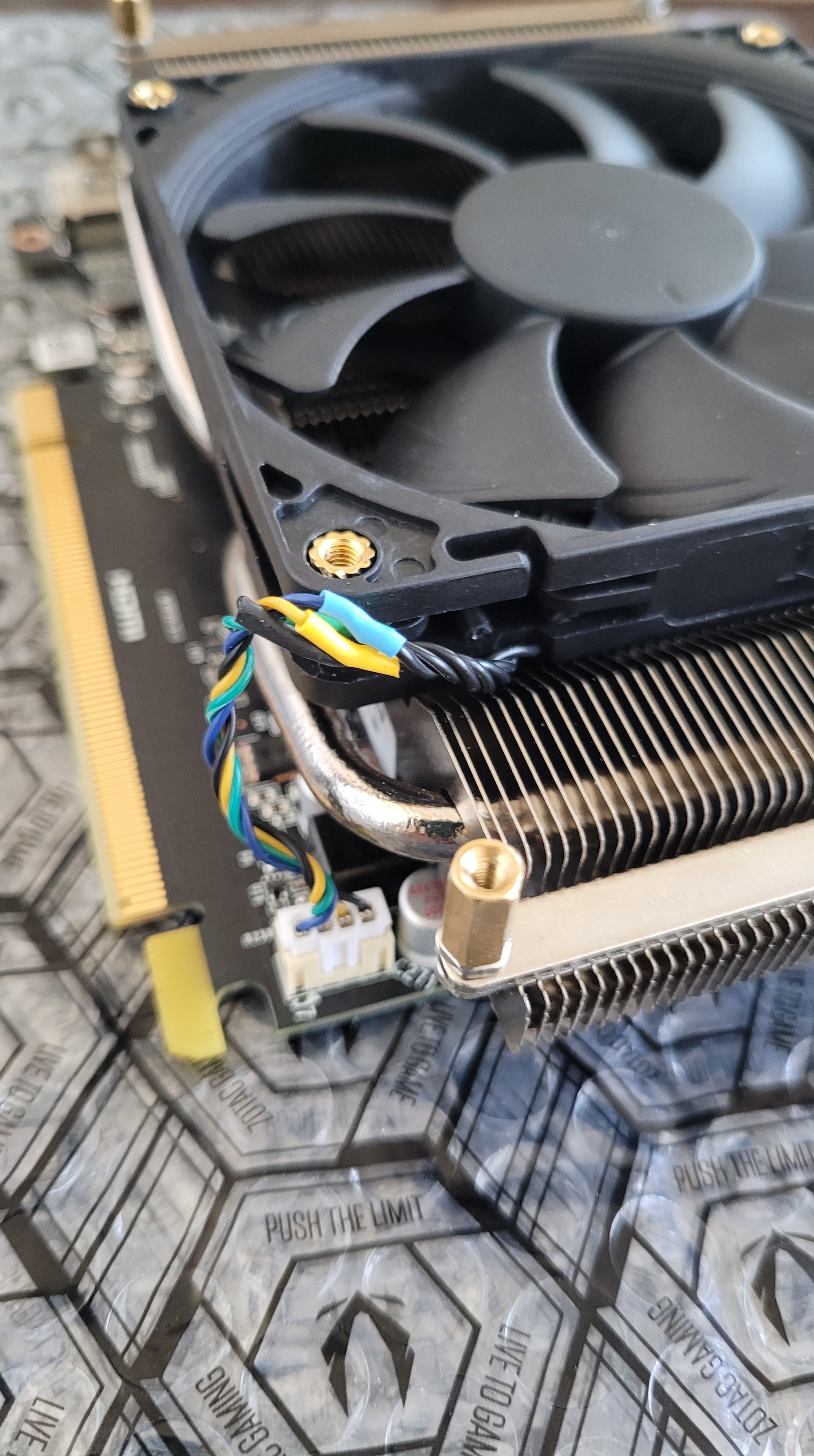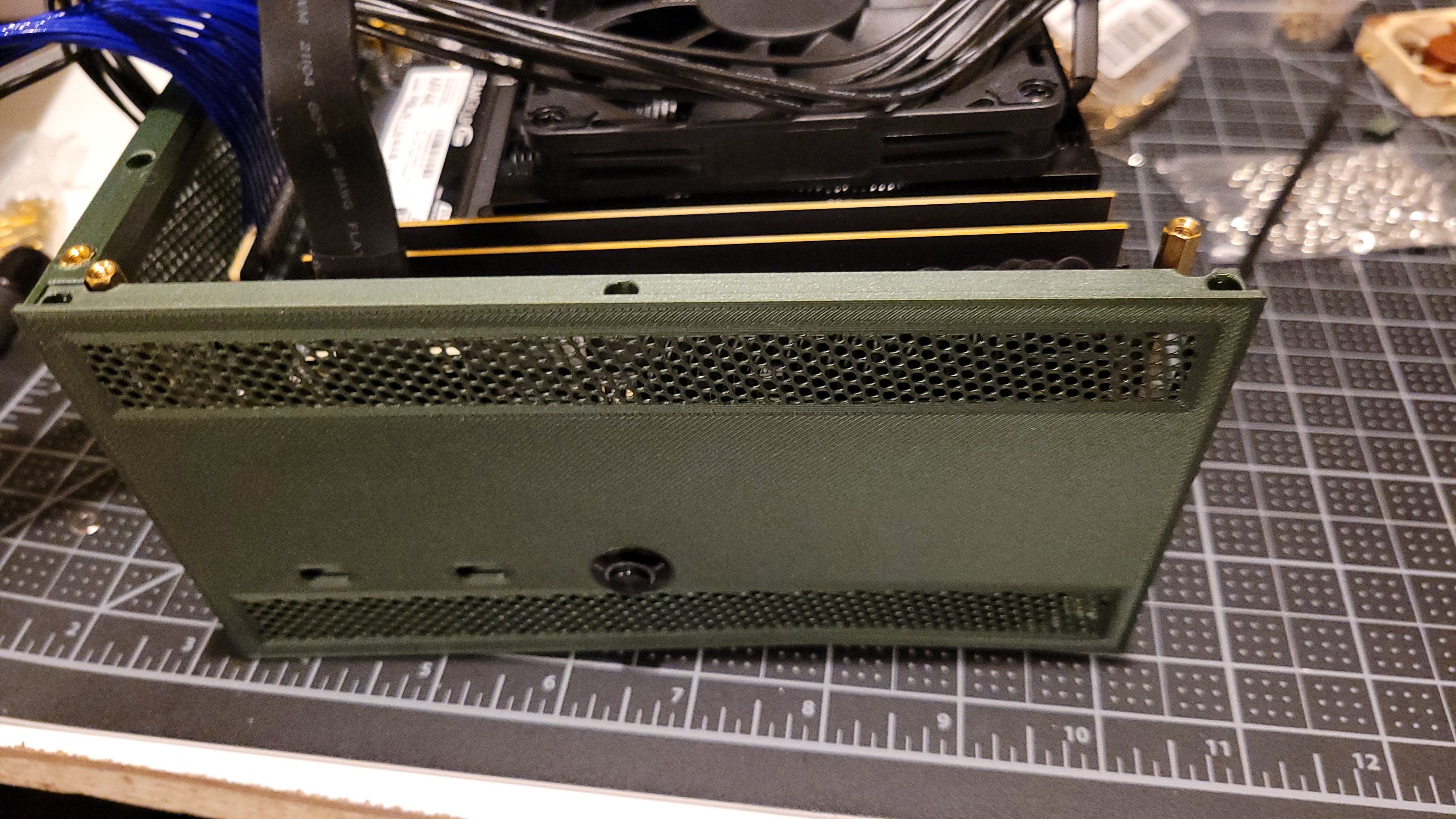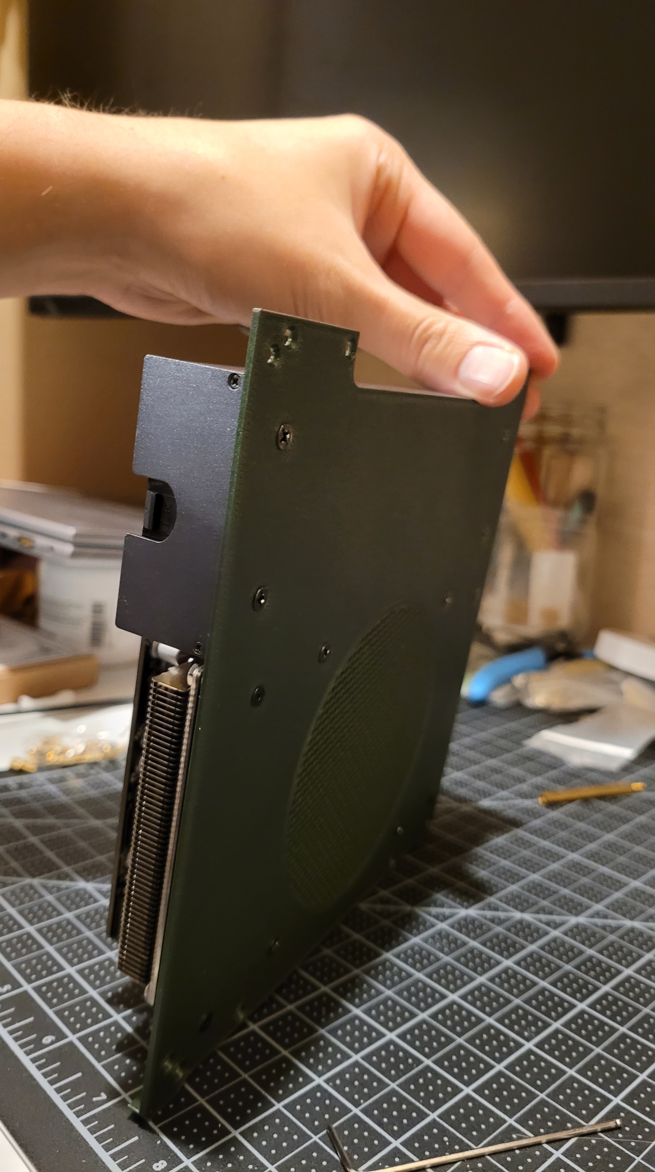 I selected mounting the GPU’s heatsink to the side panel over utilizing the GPU’s PCB mounting holes because >90% of the mass of the GPU is situated within the heatsink. By anchoring the heatsink I didn’t have to worry about the GPU’s pcb flexing and causing clearance issues.