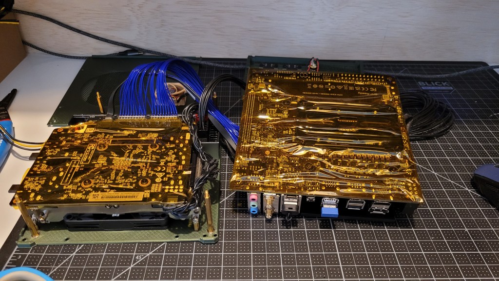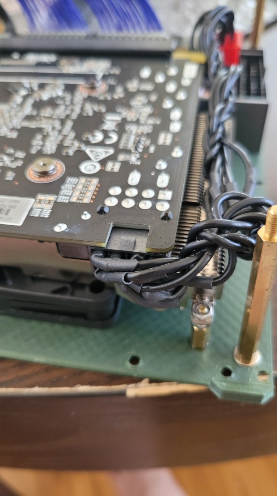 The clearance between the motherboard’s PCB and the GPU’s PCB is very tight. I measured on the order of 3mms. Plenty of room for the PCIE 4gen riser cable, but tight enough to make me nervous of any shorting risk. This is especially the case for the CPU and GPU back plates that get fairly close to each other. To help make me feel better I applied a layer of 2 inch wide kapton tape to the back to act as an insulator. Its high temperature adhesive properties helps alleviate concerns of the adhesive peeling due to high temperatures. Nothing should ever get hotter than 90deg C, but good to have some margin.