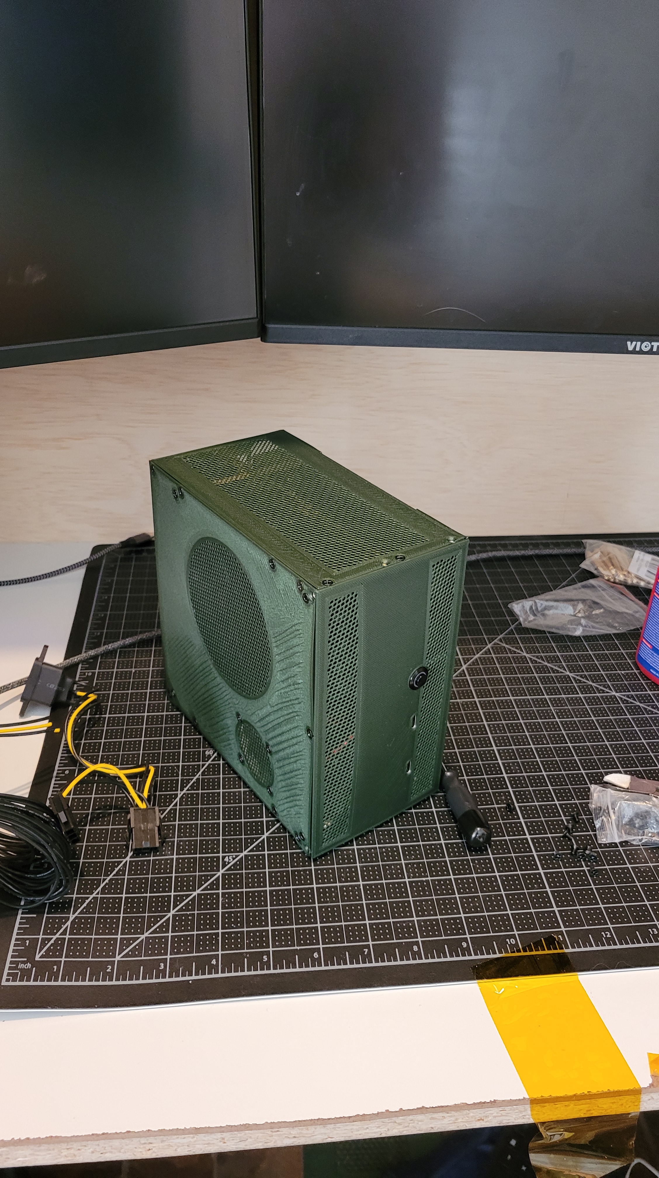 The interface between the plastic components utilize M3 threaded inserts. Super simple to create a hole within the design and to use a soldering iron to melt/embedd the inserts into the part. I designed it so that the GPU and CPU panels have the screw holes while the front, top, and bottom parts hold the threaded inserts.