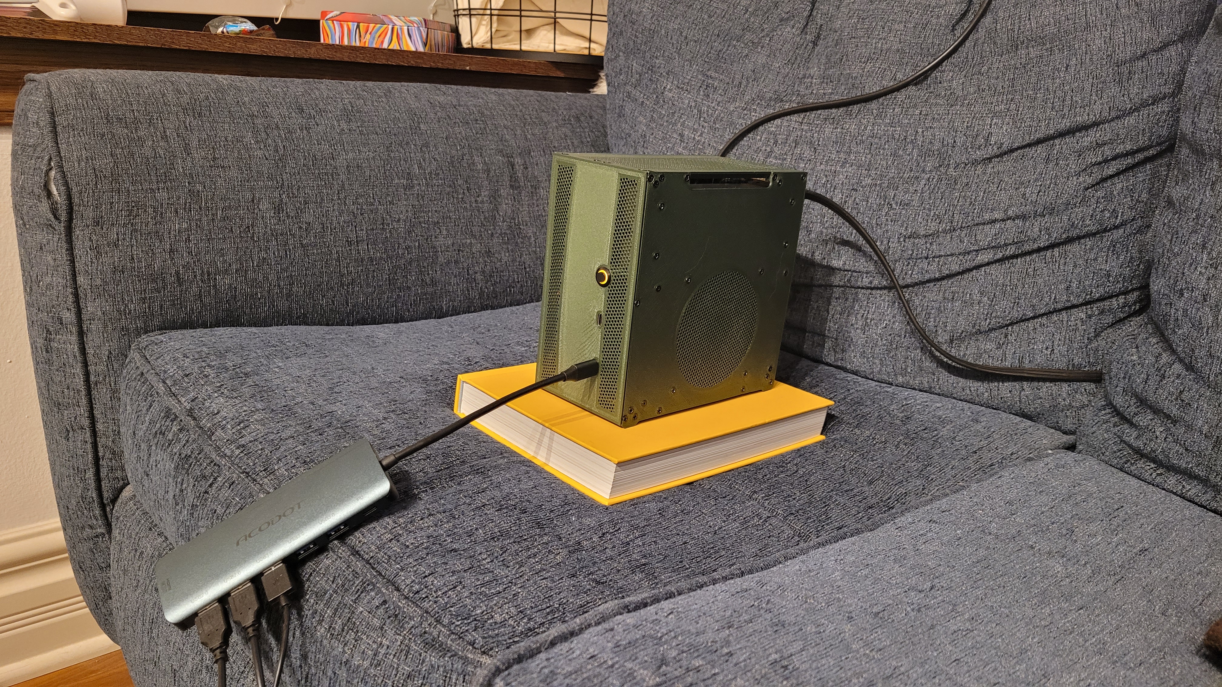 - Larger CPU cooler. Honestly I was a bit disappointed with the Noctua low profile cooler for a few reasons. because of the orientation of the fins the air gets blown straight across the VRAM sinks (Good), but also directly into the DDR stick (not good). It would be great if there were a fin orientation that allowed 90degree exit out the the back (vram) and top (nothing). Additionally there’s a lot of dead space within the case over the SSD drive. This space could easily accommodate a 120mm fan which because the area increases by the square of the radius would have resulted in much more air flow (m3/hr). Maybe a future project would be to modify a heatsink to fit this space and or design my own.