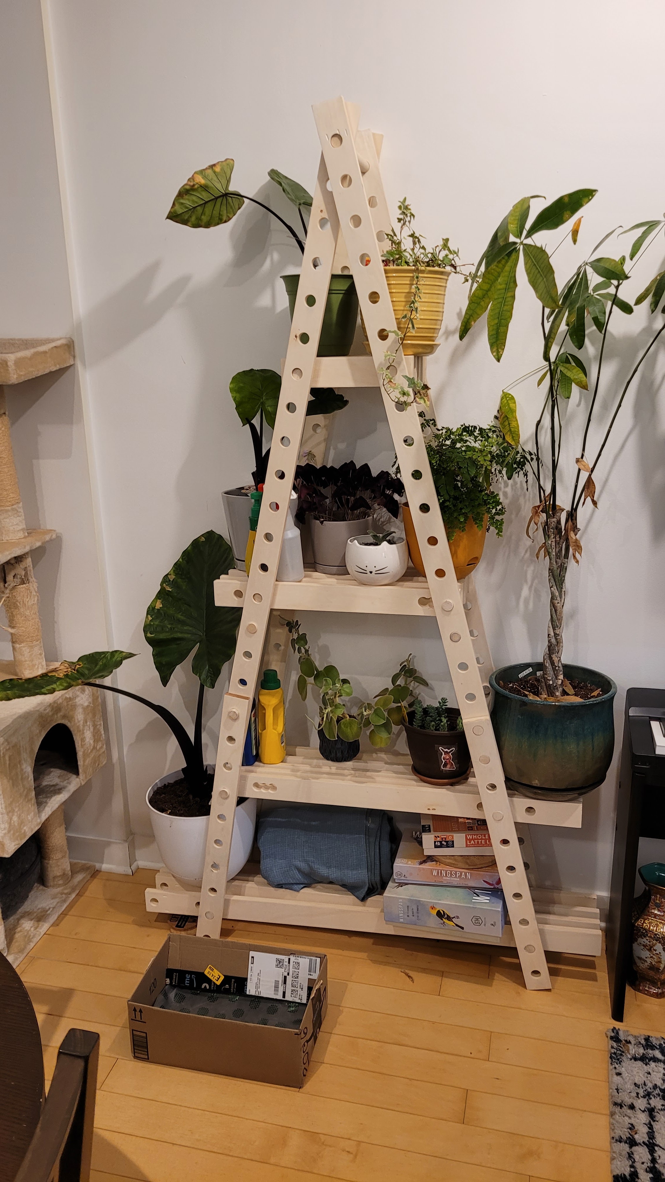 The design would be a simple ladder/a-frame shelf and use dowels as the cross beam members. Lots of cutting and drilling but in one weekend I walked away with a new shelf!